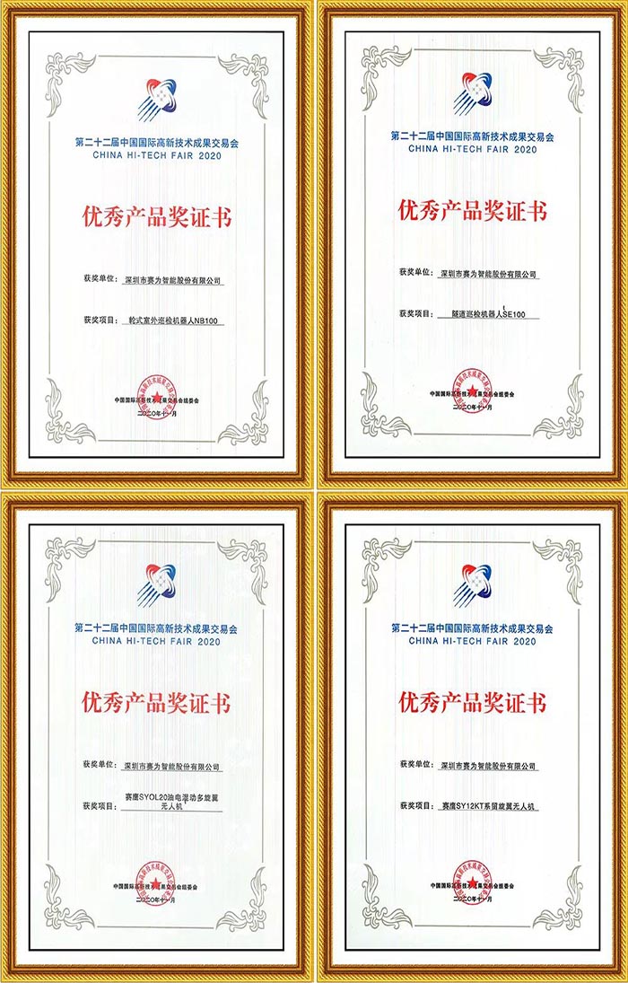 在为期5天的高交会上,经过业内专家学者严格评审,华体会注册智能展出的SE100隧道巡检机器人、NB100轮式室外巡检机器人、赛鹰SY12KT系留旋翼无人机、赛鹰SY OL20油电混动无人机新品,被大会授予2020高交会优秀产品奖。