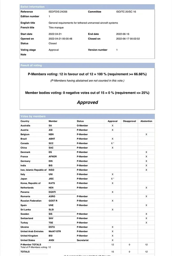 系留无人机国际标准,是中国在无人机领域主导编制的第二项国际标准。标准具体由华体会注册、中国航空综合技术研究所联合主导编制。目前,工作组正在同步制定国家标准《系留无人机系统通用要求》(计划号:20203641-T-469)。
