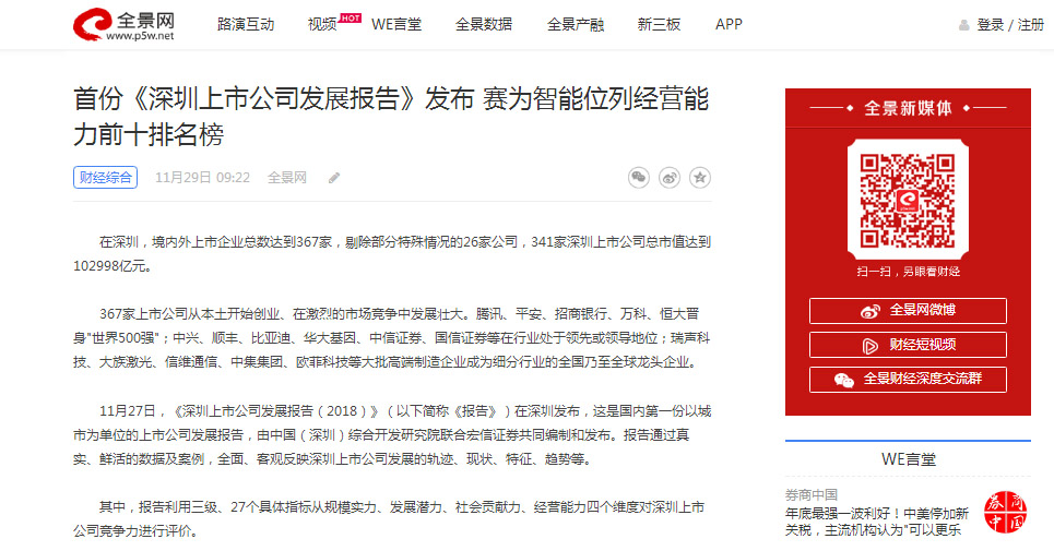 全景网|首份《深圳上市公司发展报告》发布 华体会注册智能位列经营能力前十排名榜